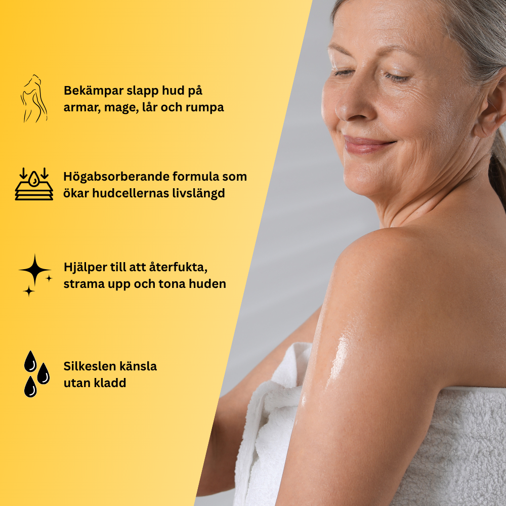 Ja, den är säker och effektiv att använda på höfter, sätesparti, mage, armar och hals – alla områden där du vill släta ut huden och minska synligheten av slapp hud.